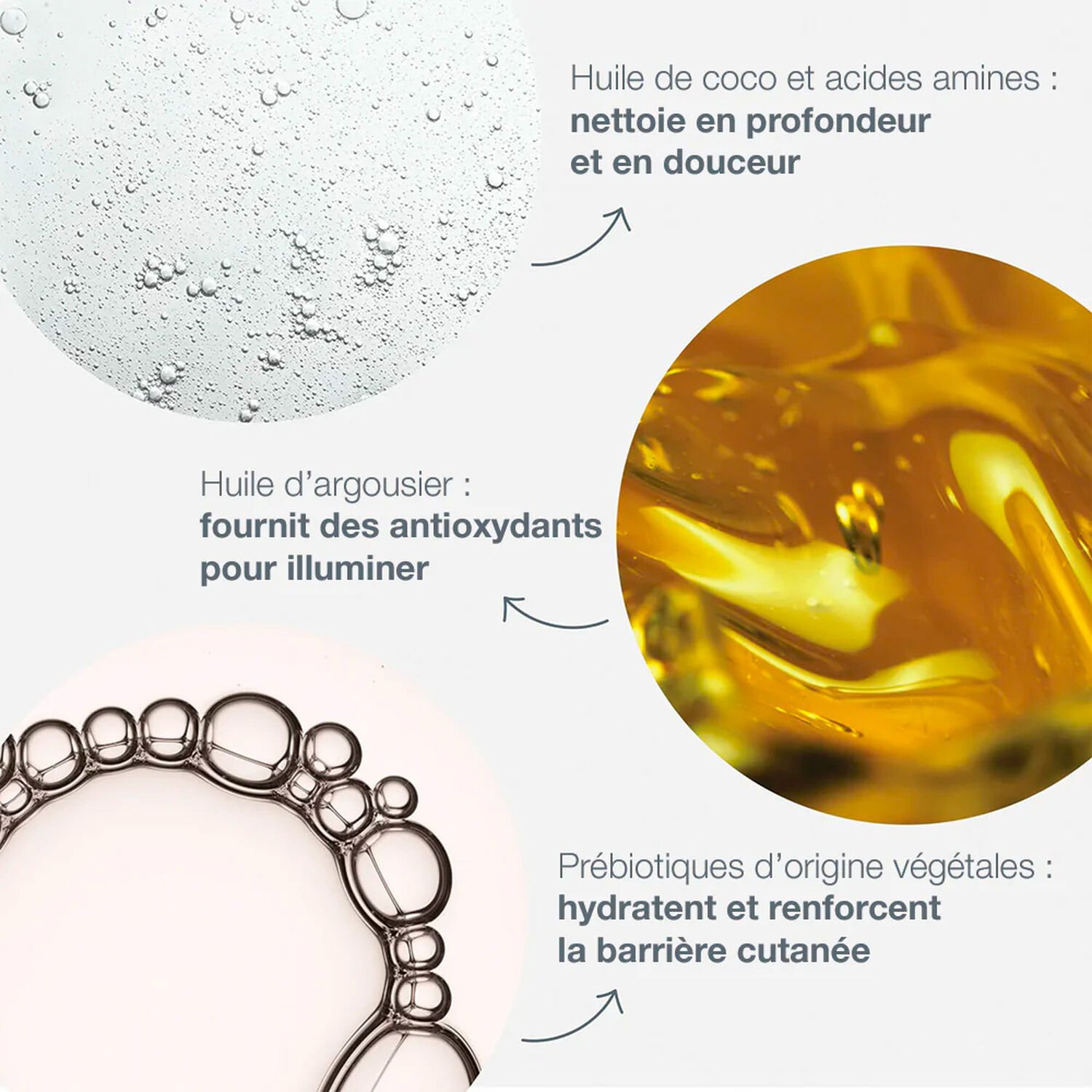 - Huile de coco & acides aminés : nettoient en profondeur, éliminent les impuretés et laissent une peau propre et saine.